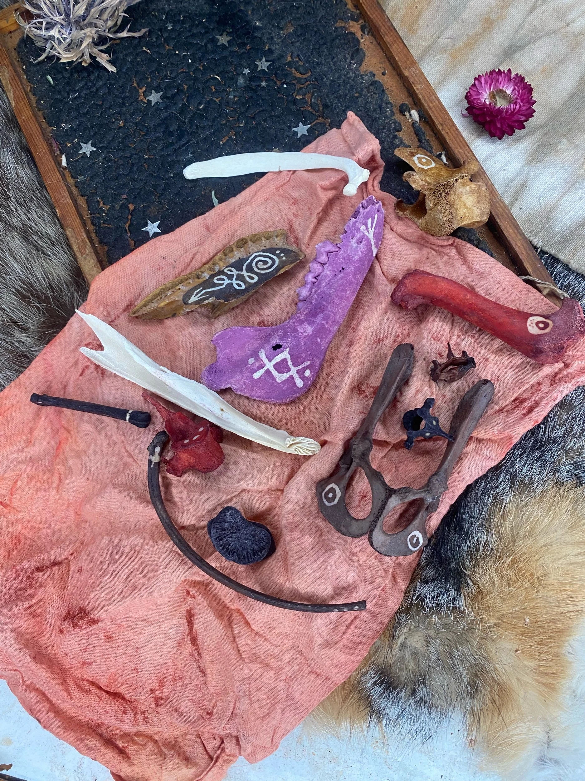 This set consists of 13 bones and a naturally dyed bag. There are an assortment of bones from different animals, colored with different botanical dyes.
