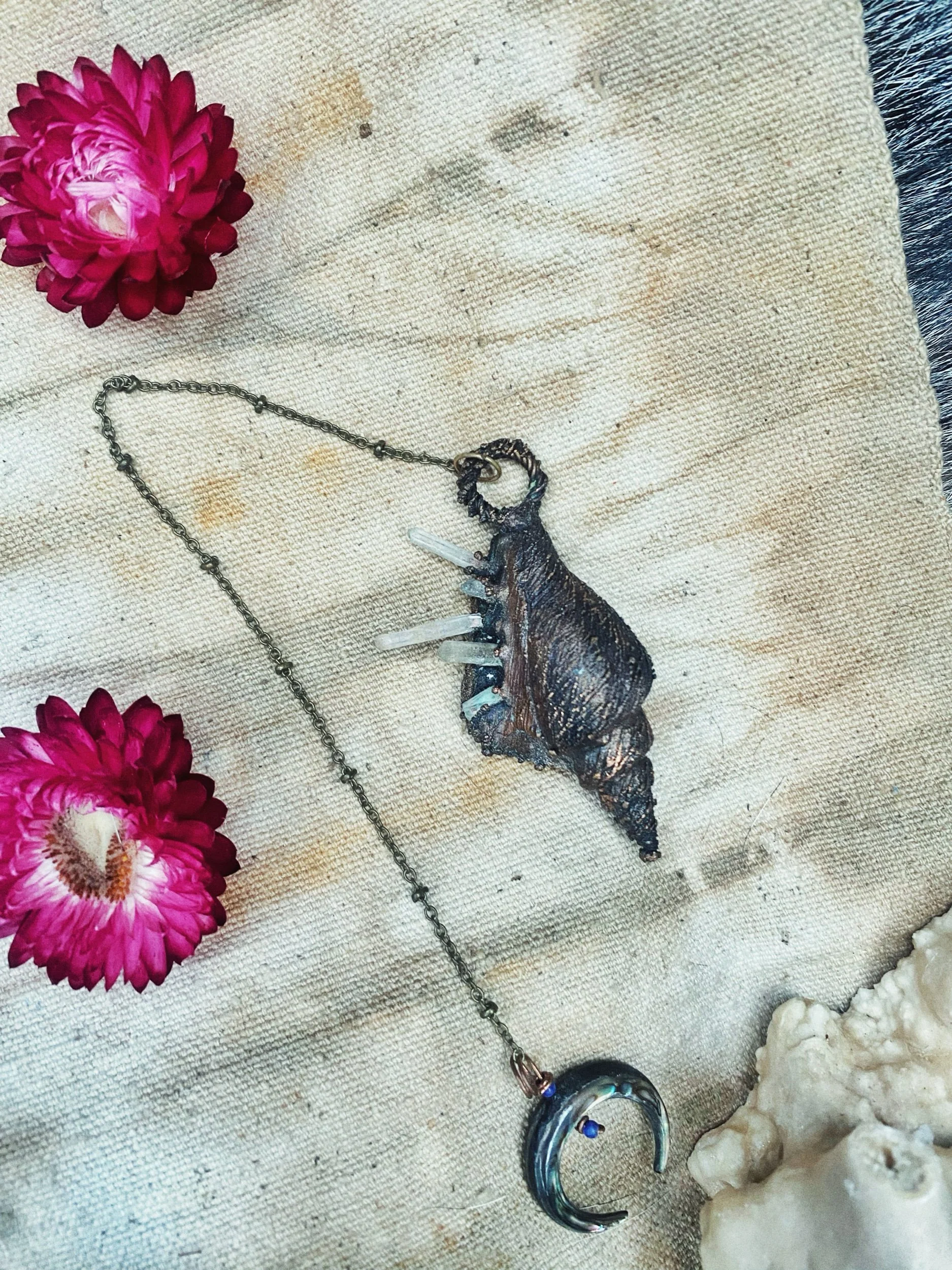 This pendulum is created by electroplating copper on a seashell encrusted with quartz point. It has a moon shaped horn and shell inlay.