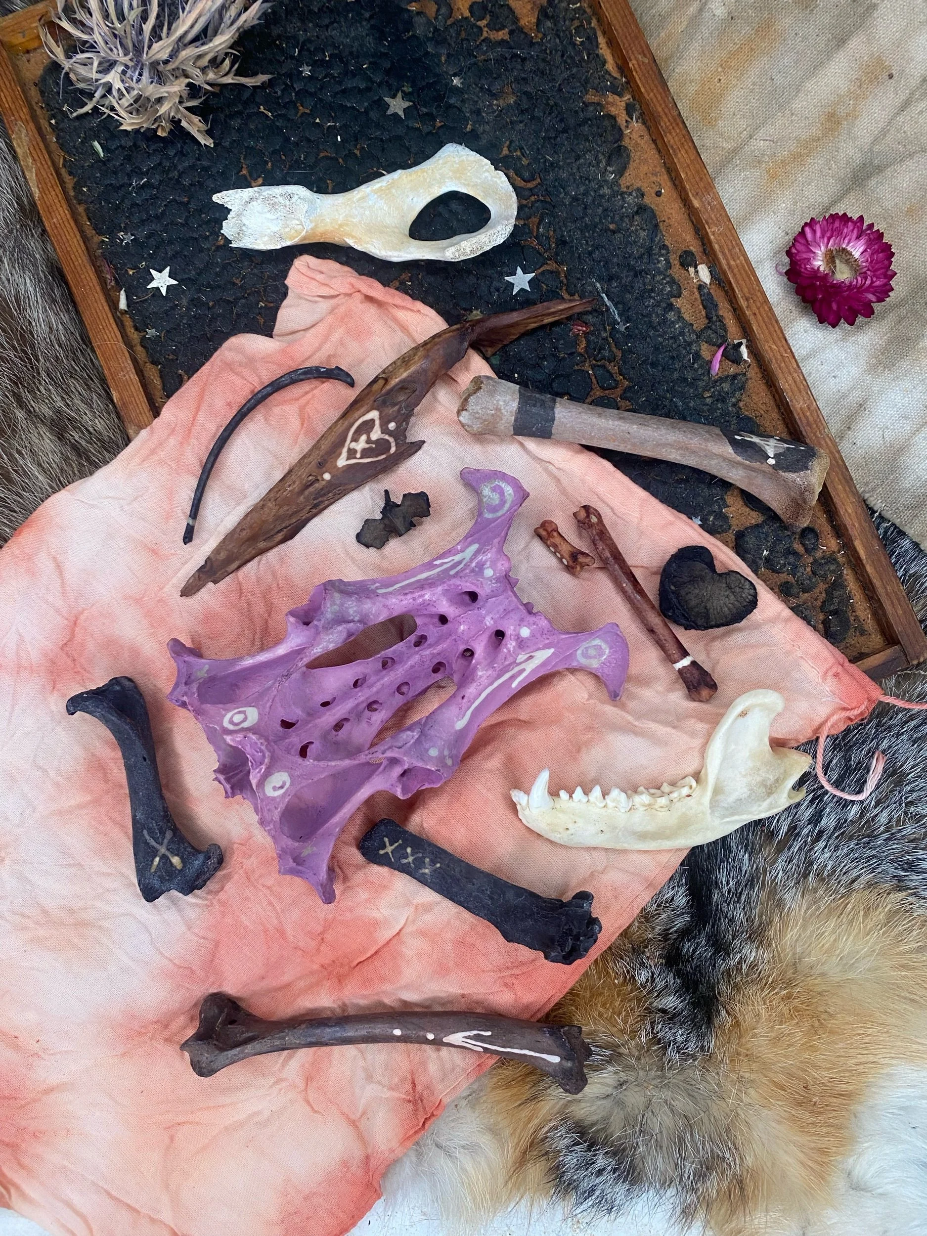 This is a set of 13 assorted bones dyes with symbols to help you distinguish between each bones during divination. There are different colors and bones from different animals.